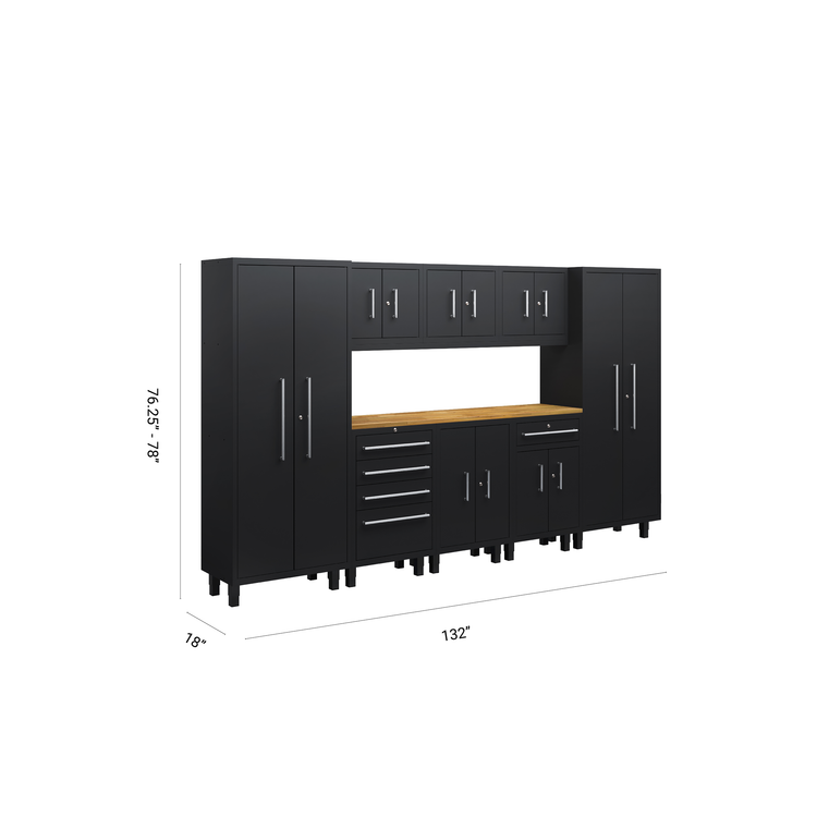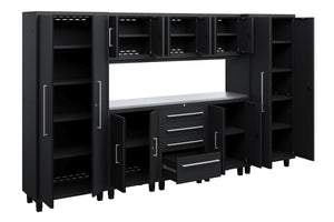 Conçue pour les passionnés. Construite pour la performance. Pour ceux qui ont besoin d'un rangement sérieux, le système de garage de 9 pièces est idéal. Combinant des casiers, des armoires murales, des armoires à outils et des armoires basses avec un plan de travail de 72 pouces, ce kit offre une solution tout-en-un pour les garages, les ateliers à domicile et les espaces industriels.