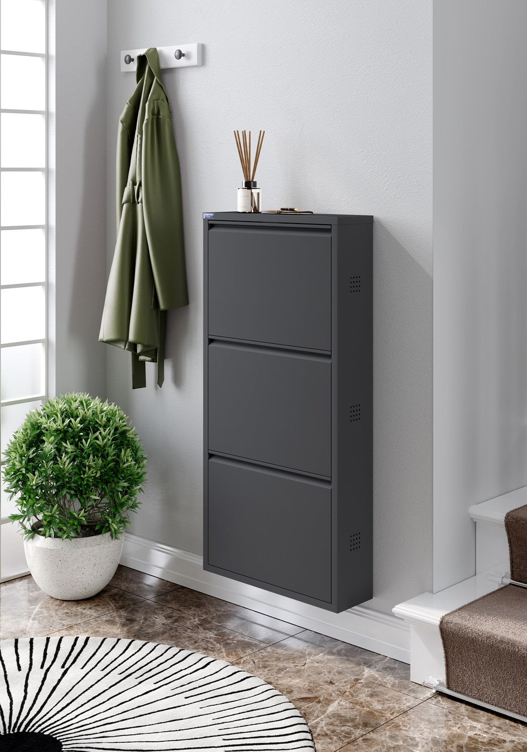 Built for durability, this shoe storage cabinet features a fully welded steel construction with an epoxy-polyester powder coating, ensuring long-lasting strength. Its sleek, space-saving design includes integrated handles and magnetic latches for effortless access, each tier provides ample room for up to two pairs of shoes per drawer. For optimal ventilation, the square hole model promotes airflow, preventing moisture buildup—ideal for humid spaces like garages or bathrooms. Designed for versatility, this cabinet fits seamlessly in closets, bedrooms, entryways, and more, with rear mounting holes for wall installation. Easy to use and maintain, its smooth metal surface wipes clean with ease.