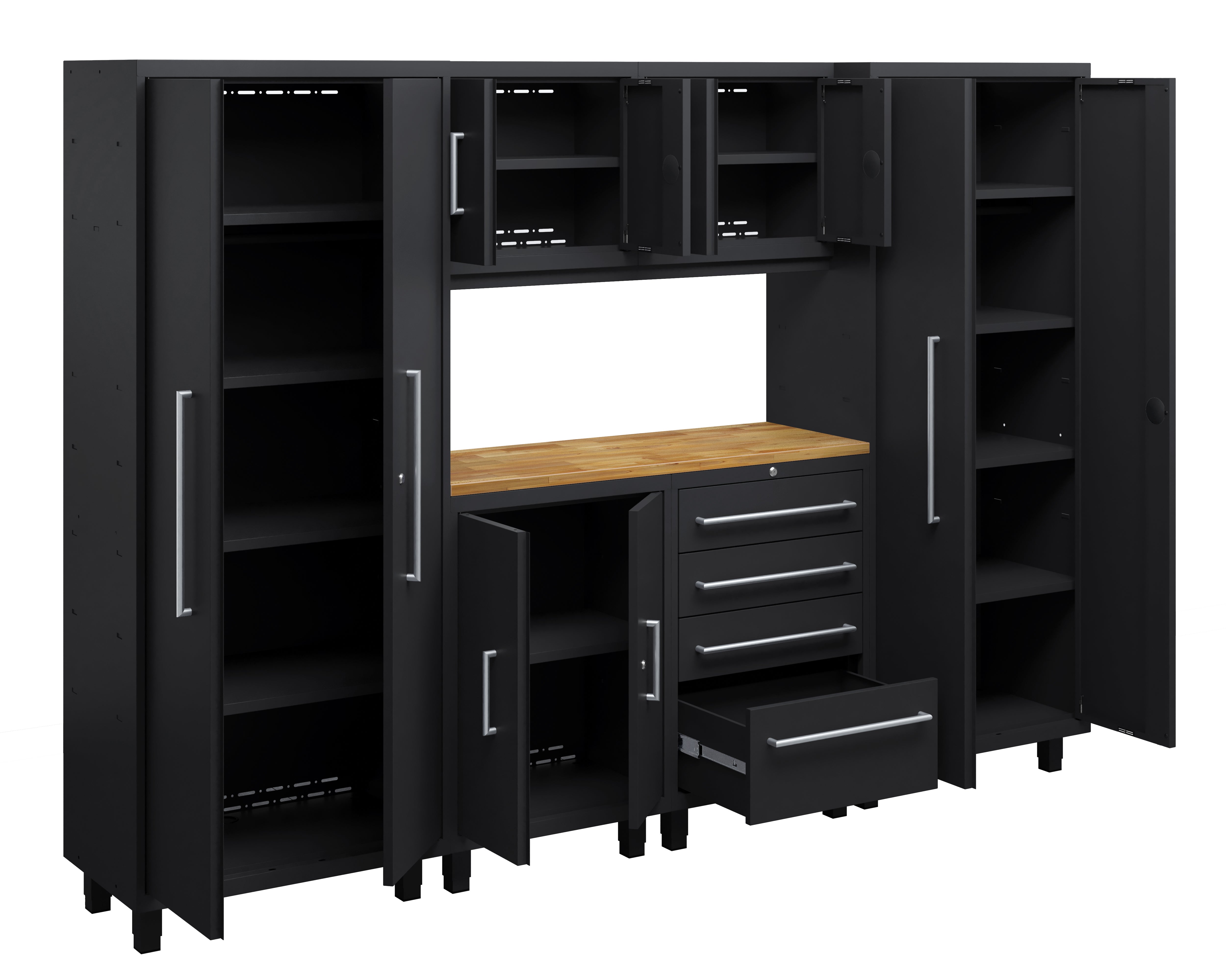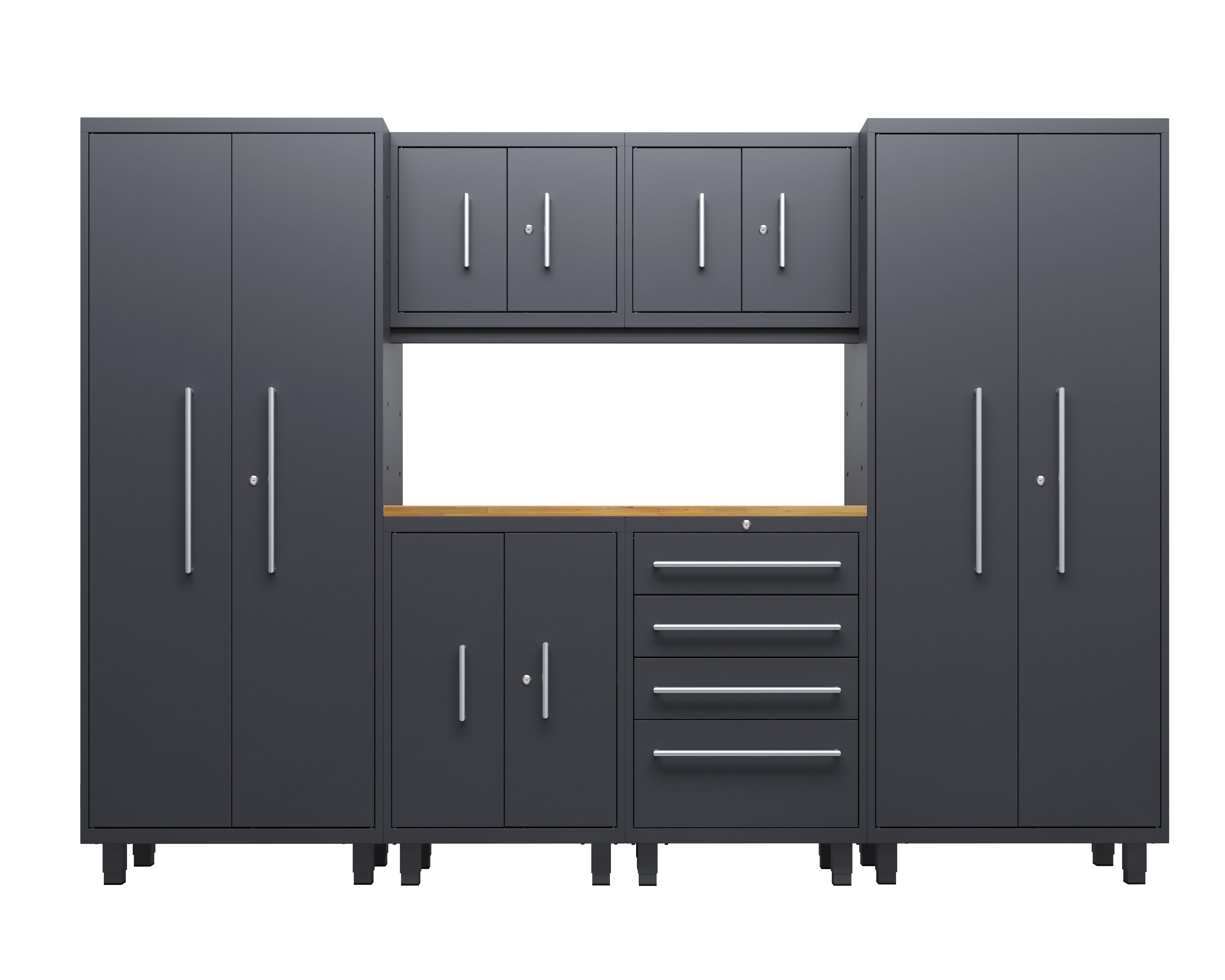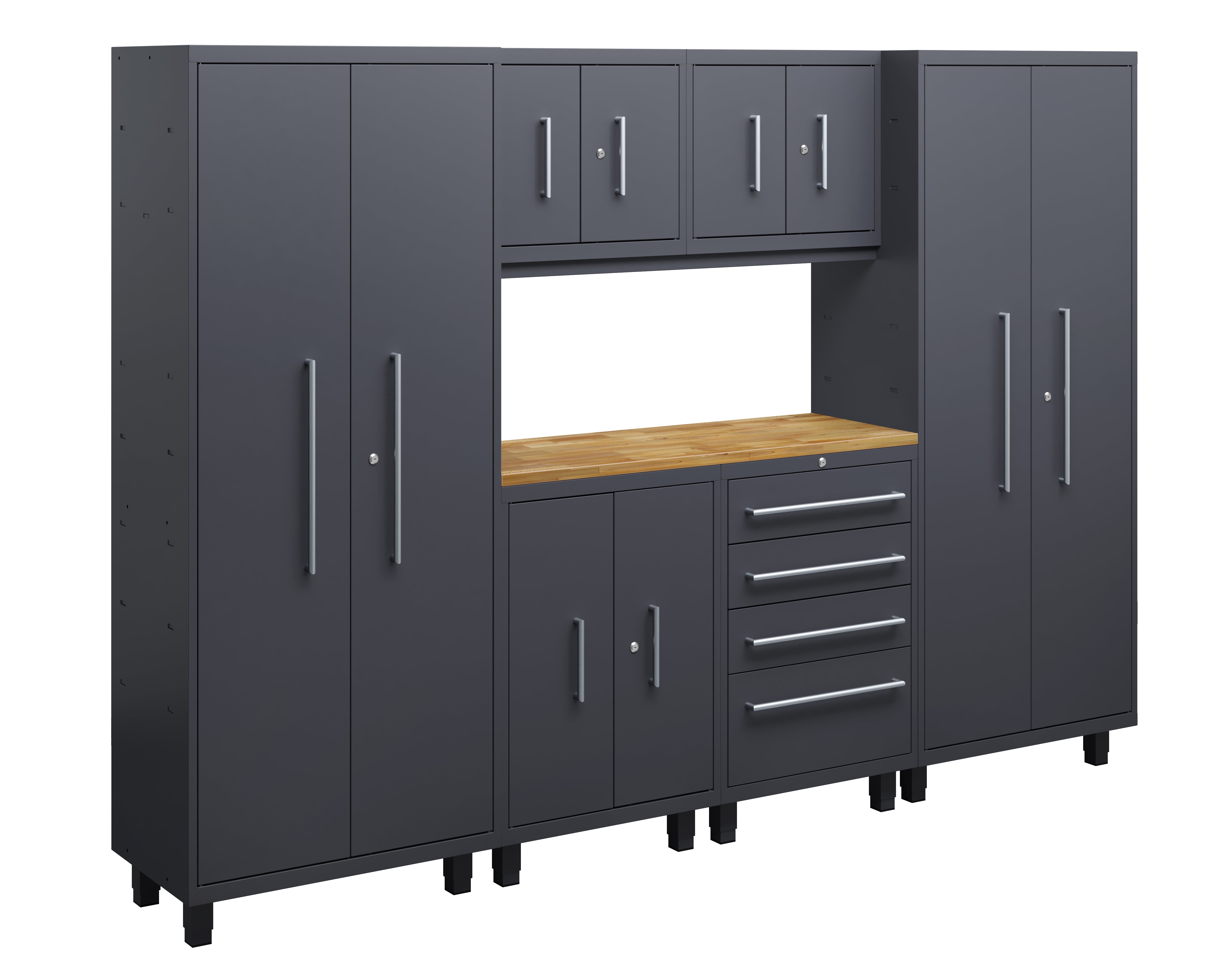 Maximize Your Garage Space with Modular Flexibility. The 7-Piece Storage Set delivers a complete organizational solution. Featuring two lockers, two wall cabinets, a tool cabinet, a base cabinet, and a 48” countertop, this set transforms any garage into a highly efficient space.