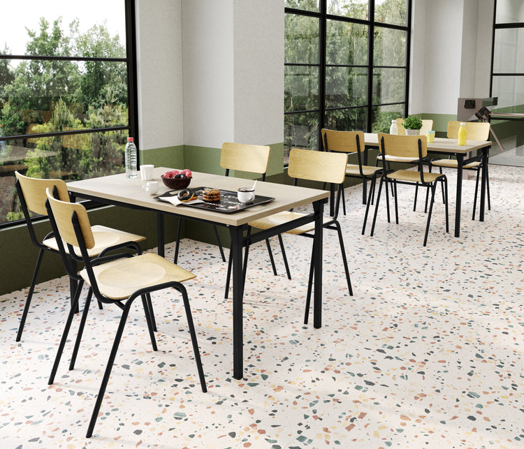 Upgrade your space with these versatile, multipurpose wooden canteen chairs. Sold in convenient packs of 4, they’re ideal for restaurants, cafeterias, and larger areas. Featuring durable glides for floor protection, these chairs are perfect for soft floors. The sleek design comes in two stylish options: a white or black frame paired with a natural beech seat and back. With compact dimensions (15.16" W x 15.4" D x 17.7" H), they offer both comfort and modern style, making them a perfect fit for any setting.