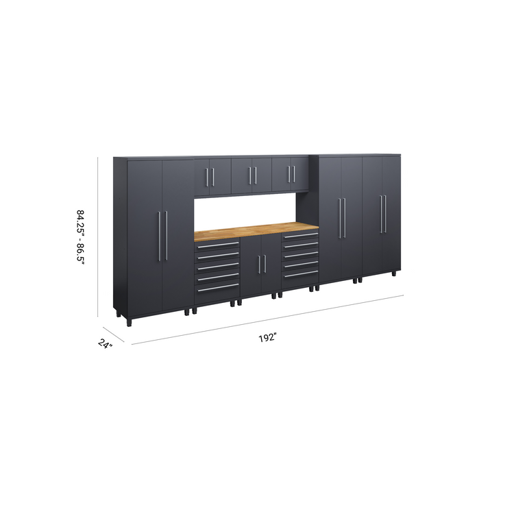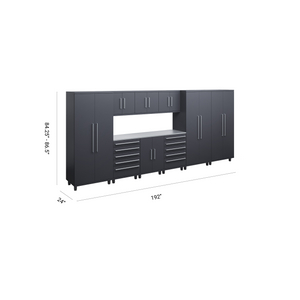 The 10-piece system is designed for ultimate efficiency, featuring multiple lockers, wall cabinets, tool storage, and an 84” work surface. Whether used in a garage, workshop, or industrial space, this setup provides unparalleled organization and durability.