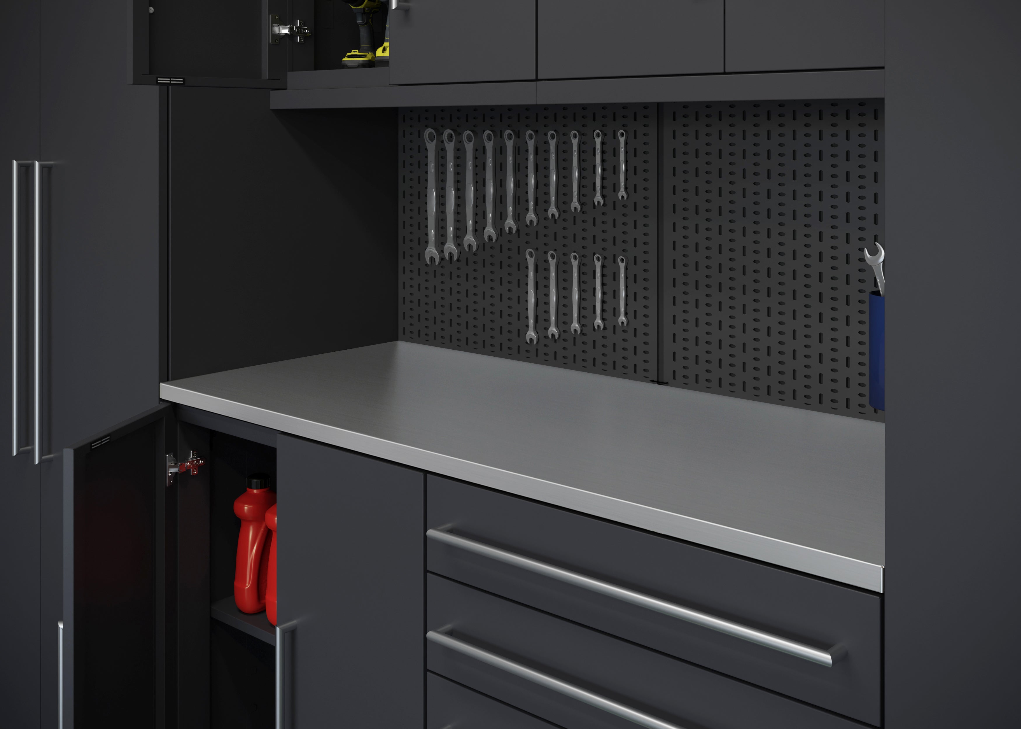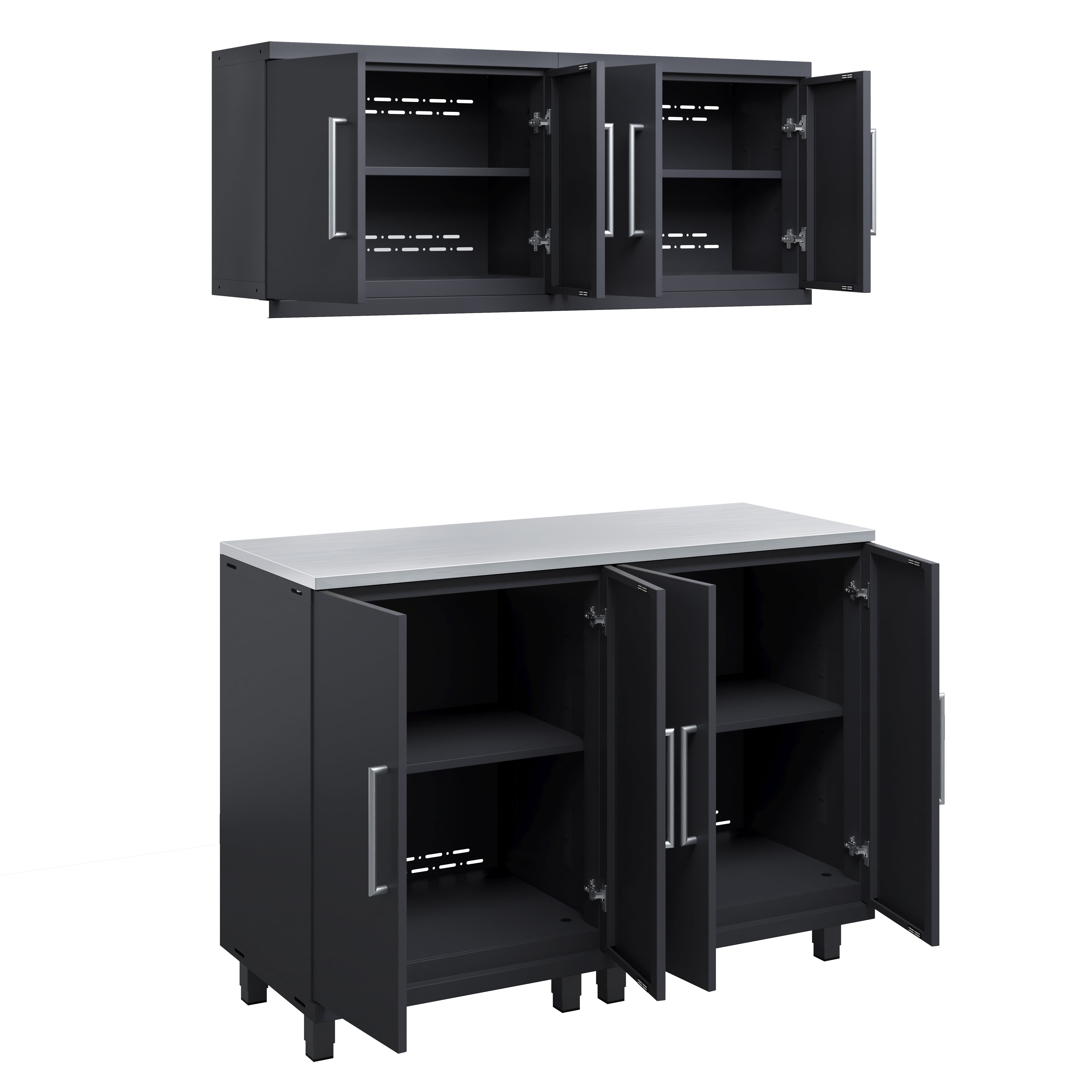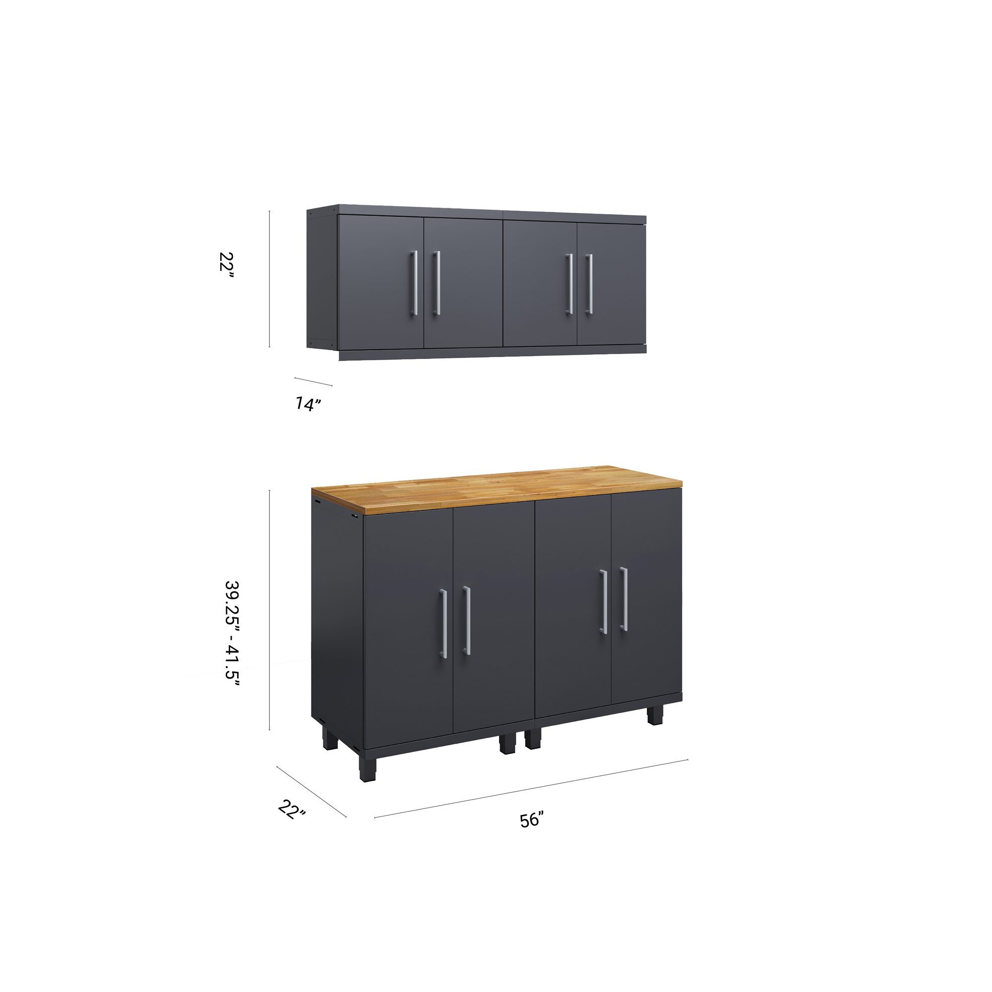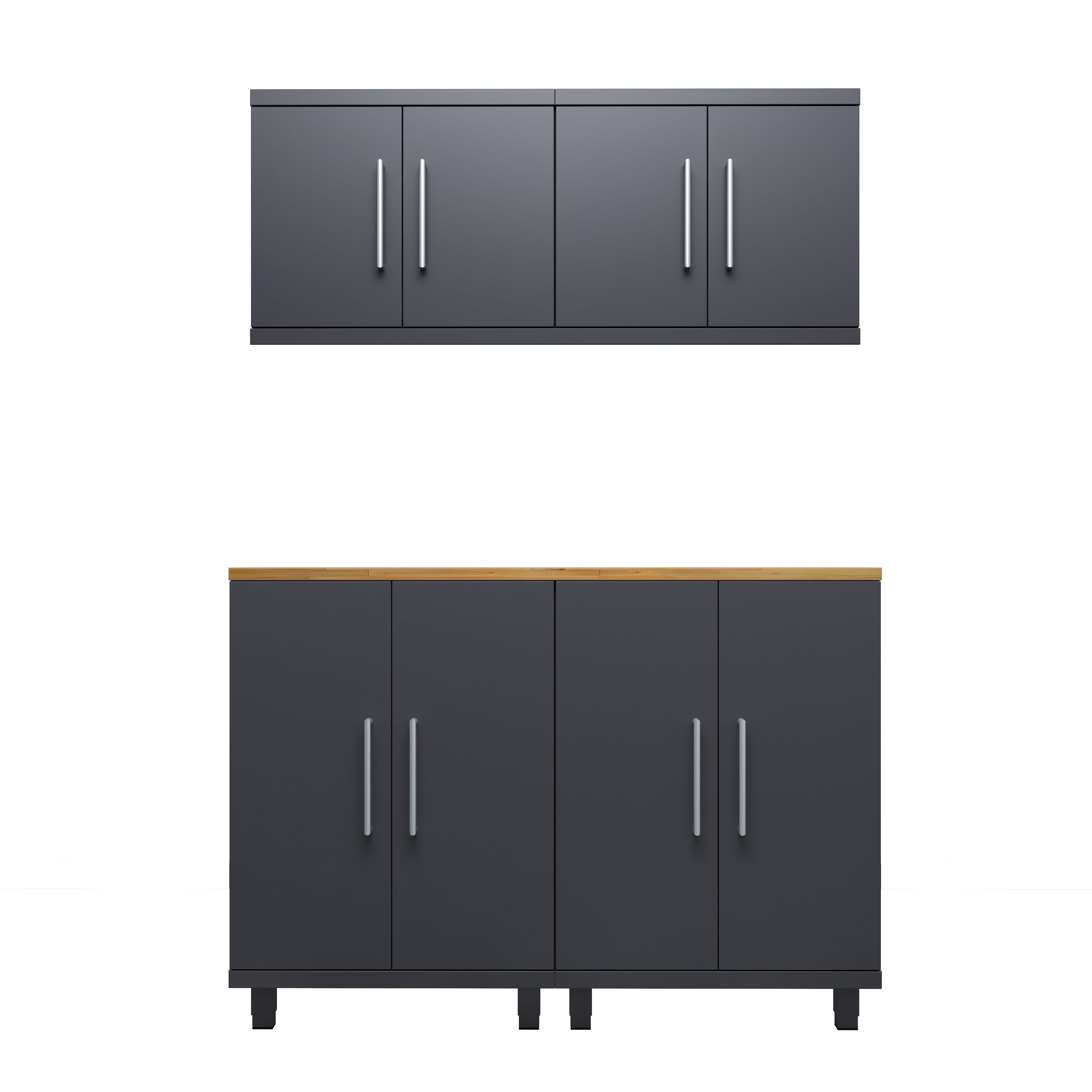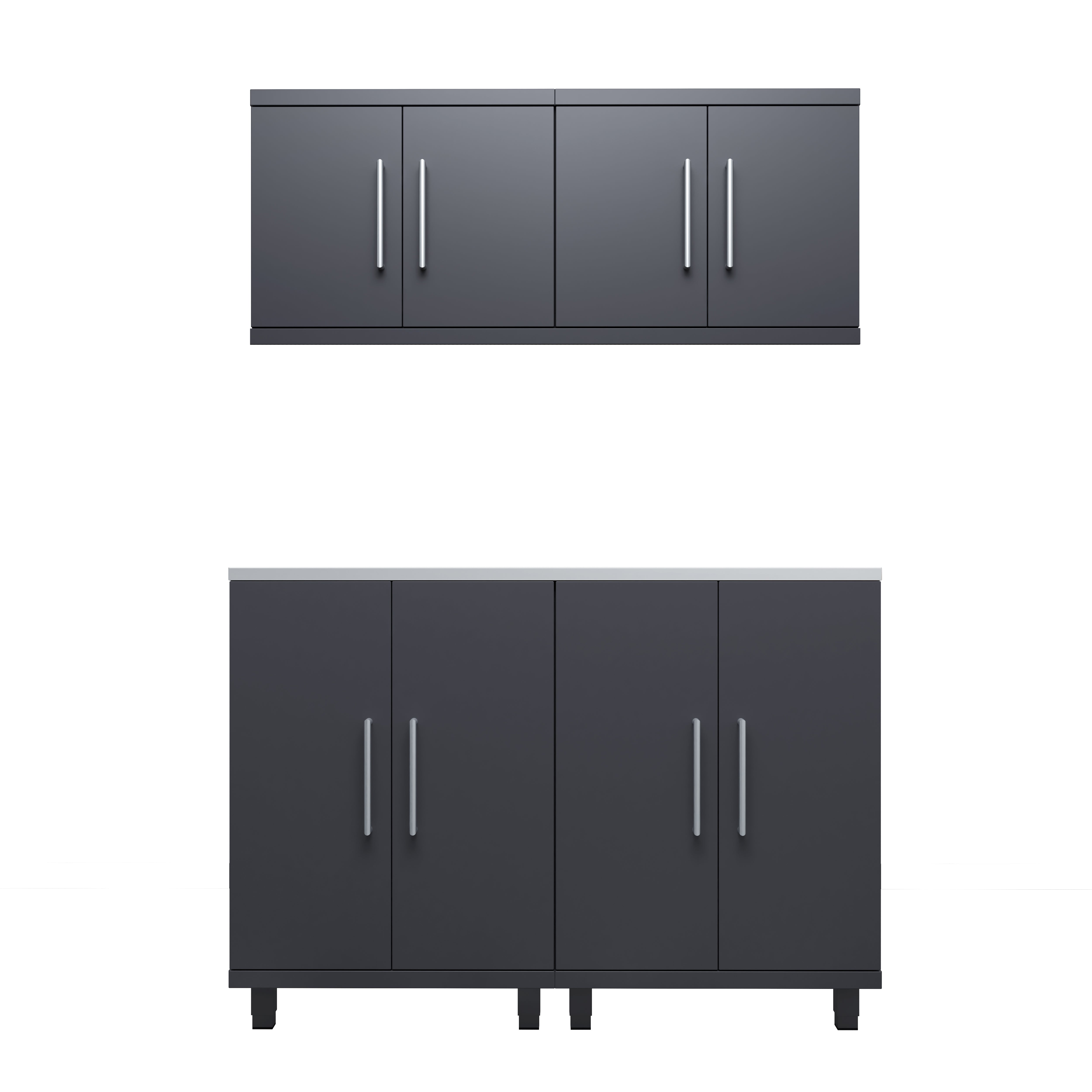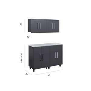 The 5-piece workstation kit combines robust storage with a functional workspace. Featuring two base cabinets, two wall cabinets, and a 56” top, this configuration optimizes organization while enhancing efficiency in your garage or workshop.